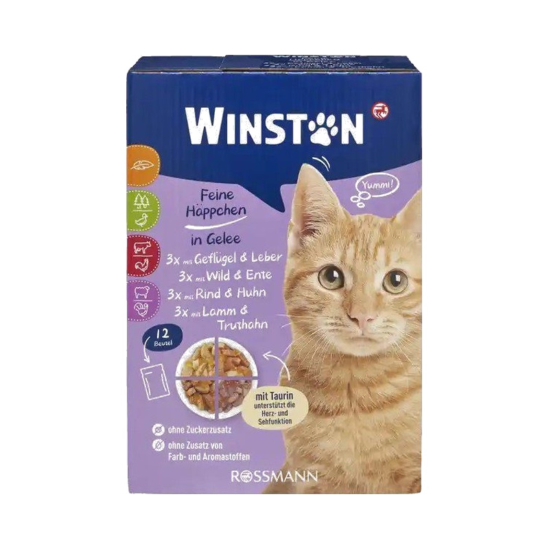 پوچ مولتی‌وعده‌ای وینستون شامل ۳ طعم خروس با سس ماست، ۳ طعم گاو با سس بریانی، ۳ طعم ماهی با سس خامه و ۳ طعم گوسفند با سس پروونس است که تنوعی خوشمزه و مقوی را برای حیوان فراهم می‌کند. این محصول با تاورین غنی شده و به بهبود عملکرد قلب و تقویت بینایی کمک می‌کند. ترکیبات باکیفیت و متعادل آن، تأمین‌کننده مواد مغذی ضروری برای حیوان است. طعم‌های متنوع و جذاب باعث افزایش اشتها و رضایت حیوان می‌شوند. این پک انتخابی عالی برای تغذیه روزانه و متنوع حیوان شماست.